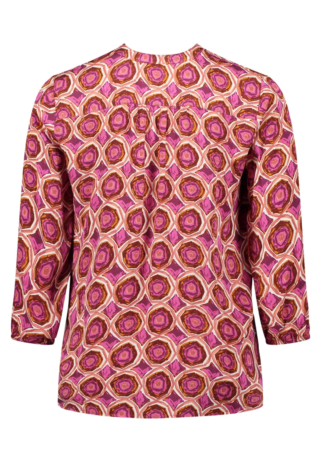 Dieses figurumspielende Blusenshirt in Weiß mit violetten Punkten verbindet femininen Stil mit hohem Tragekomfort. Der elegante Wasserfall-Ausschnitt mit modernem Stehkragen verleiht dem Look eine besondere Note, während die 3/4-Ärmel und die Gesamtlänge von 70 cm eine schmeichelhafte Silhouette zaubern. Aus pflegeleichter Viskose gefertigt – ideal für stilvolle Alltags- oder Büro-Outfits.