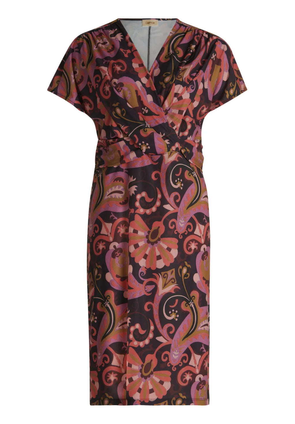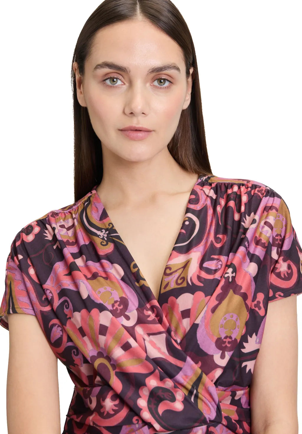 Dieses knieumspielende Jerseykleid in Violett und Rosa begeistert mit einem lebendigen grafischen Muster und einer figurbetonten Passform. Der feminine V-Ausschnitt und die kurzen Ärmel unterstreichen die schmeichelhafte Silhouette, während die weiche Jersey-Qualität für angenehmen Tragekomfort sorgt. Mit 102 cm Gesamtlänge ist es der perfekte Begleiter für stilvolle Auftritte – ob im Alltag oder zu besonderen Anlässen.