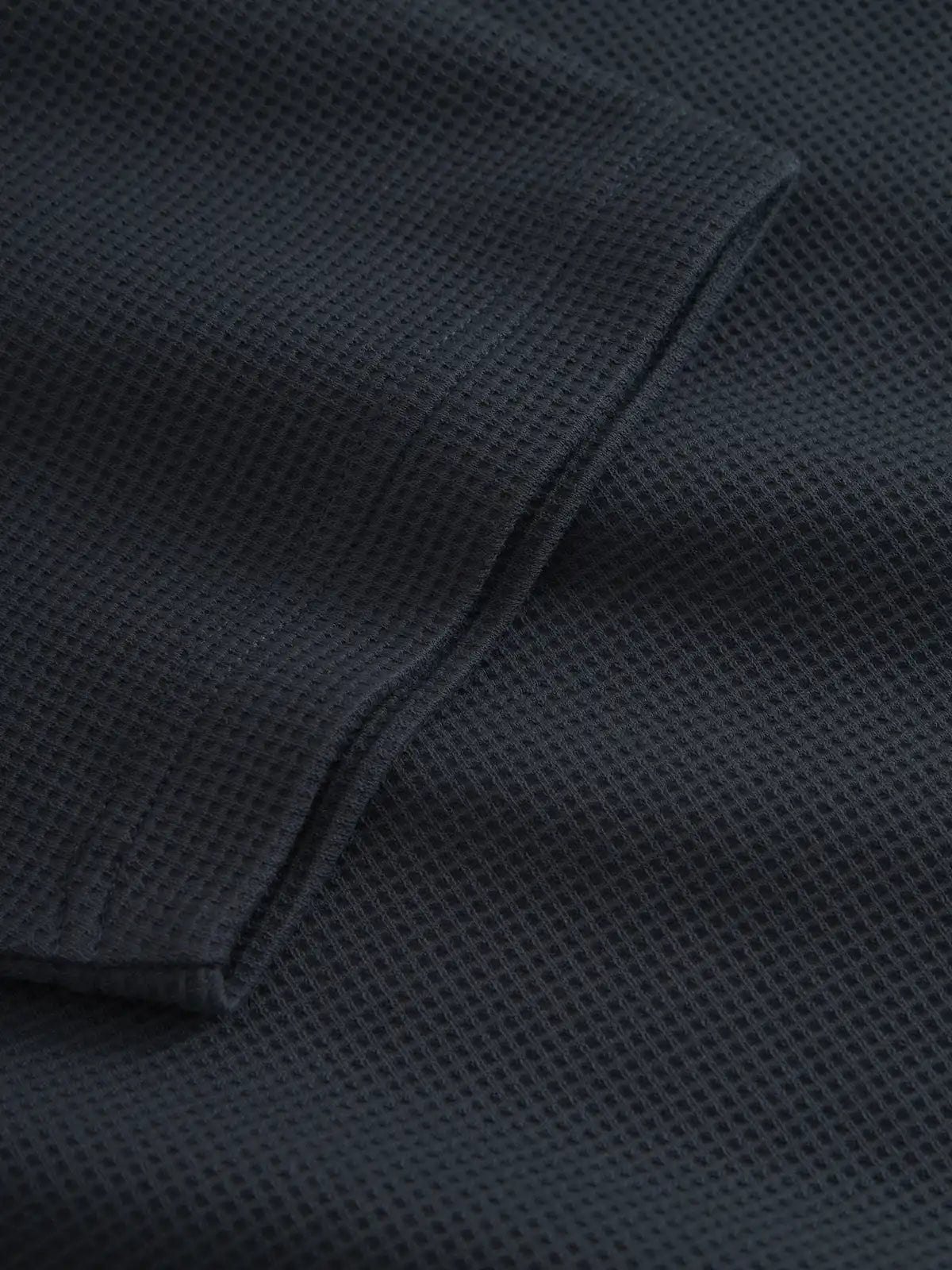 Es ist aus einem mittelschweren Waffelgewebe gefertigt, mit offenem Kragen und einem gestickten Gabba-Logo auf der Brust.