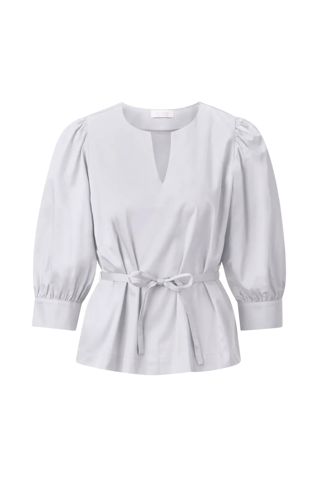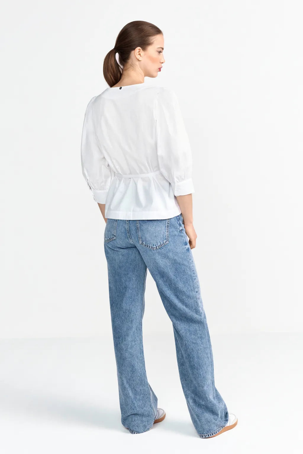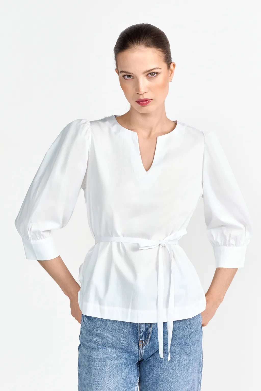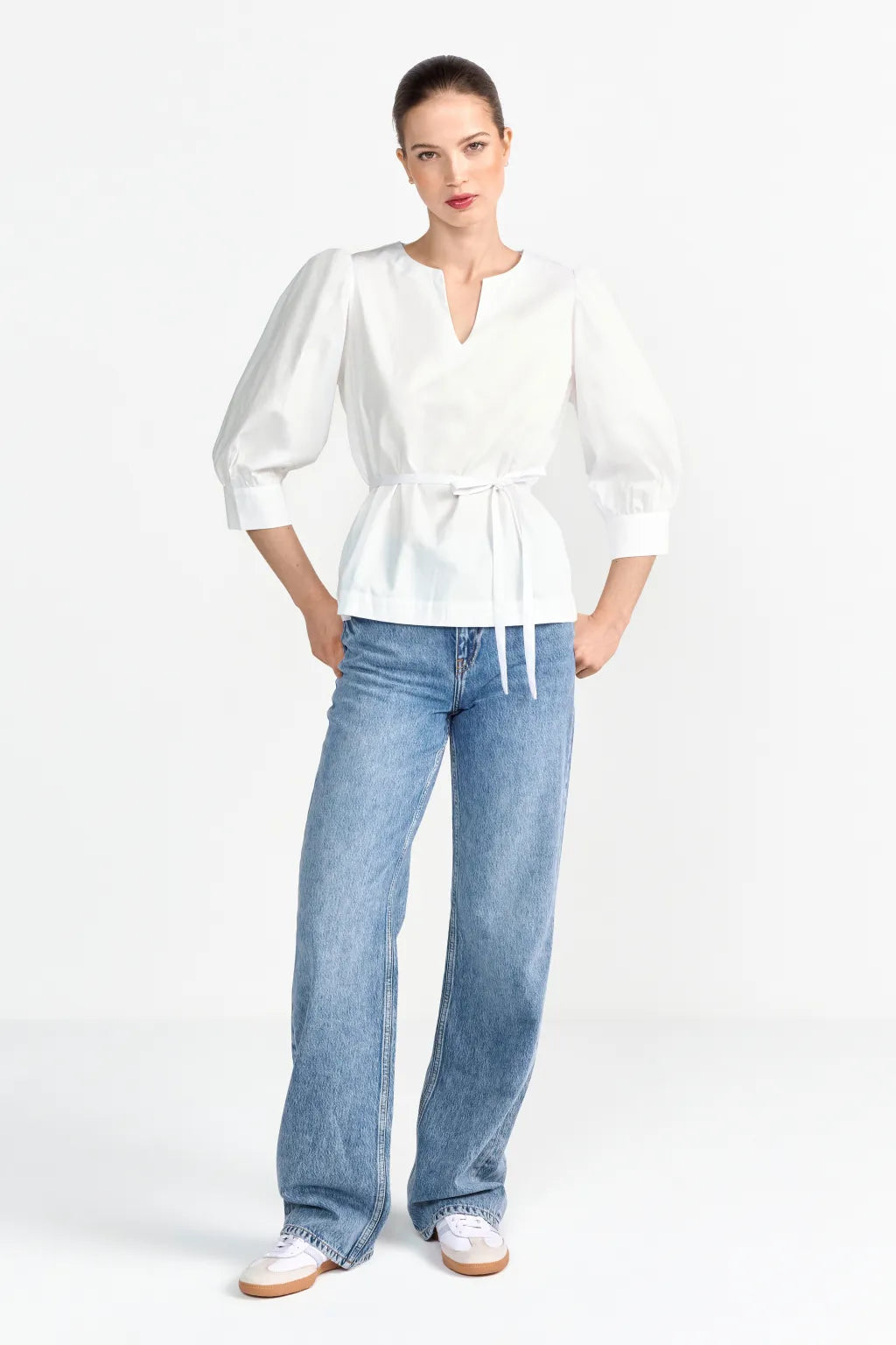 Diese weiße Baumwollbluse überzeugt mit femininen Details und luftigem Tragekomfort. Die stilvollen Puffärmel verleihen ihr eine moderne Silhouette, während das Bindeelement an der Taille für eine individuelle Passform und eine betonte Figur sorgt. Ein vielseitiges Lieblingsstück für elegante wie lässige Looks.