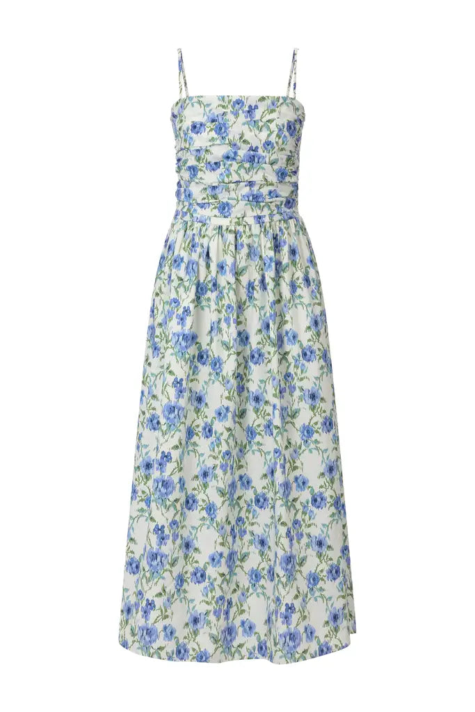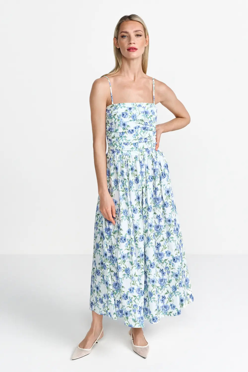 Dieses Midikleid in der Farbe Palace Blue wurde in Portugal aus nachhaltigem Stoff hergestellt und zeigt elegante blaue Blumen und grüne Stängel auf weißem Grund. Es ist mit einem Bandeau-Schnitt und abnehmbaren Trägern versehen.