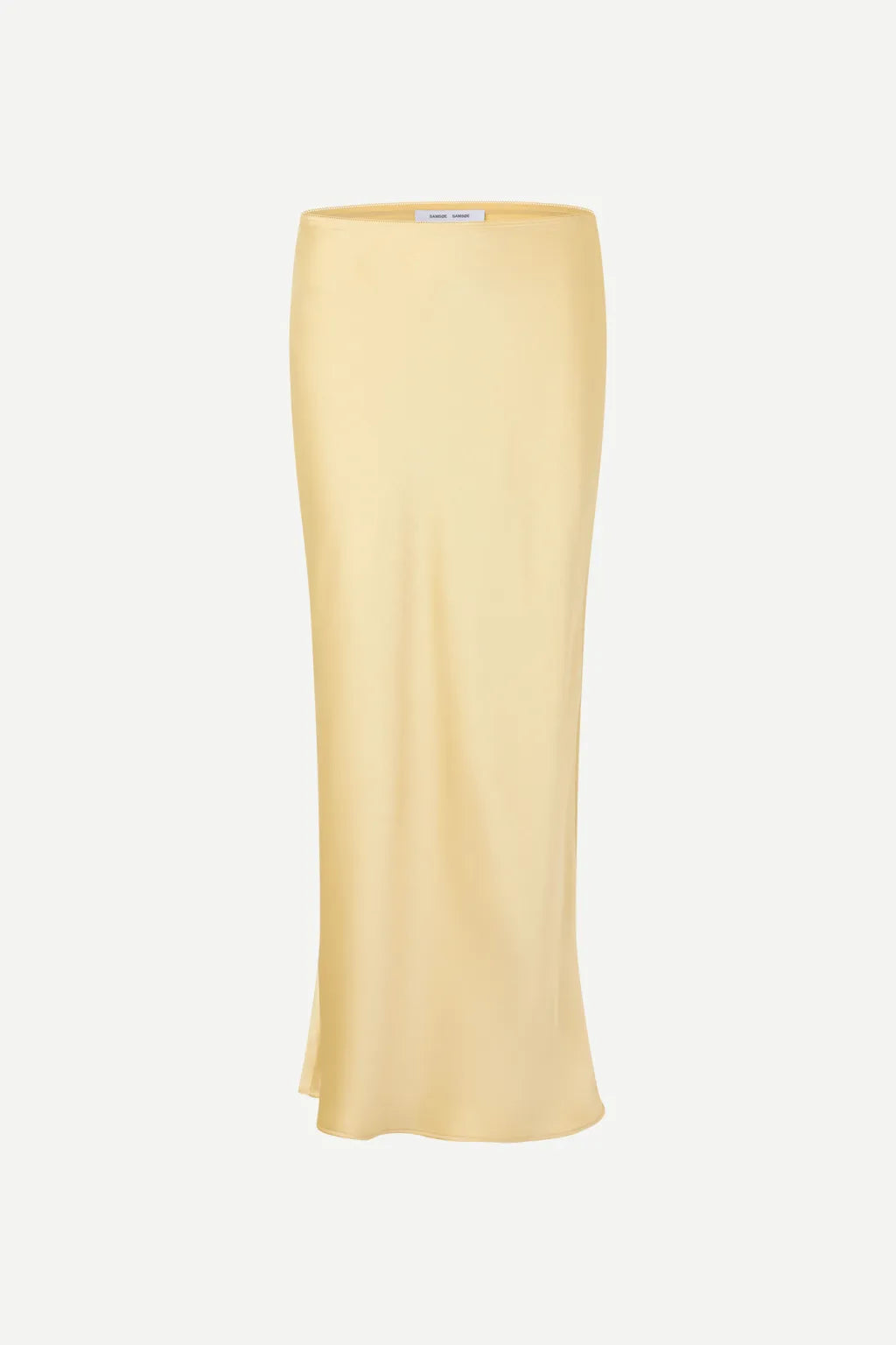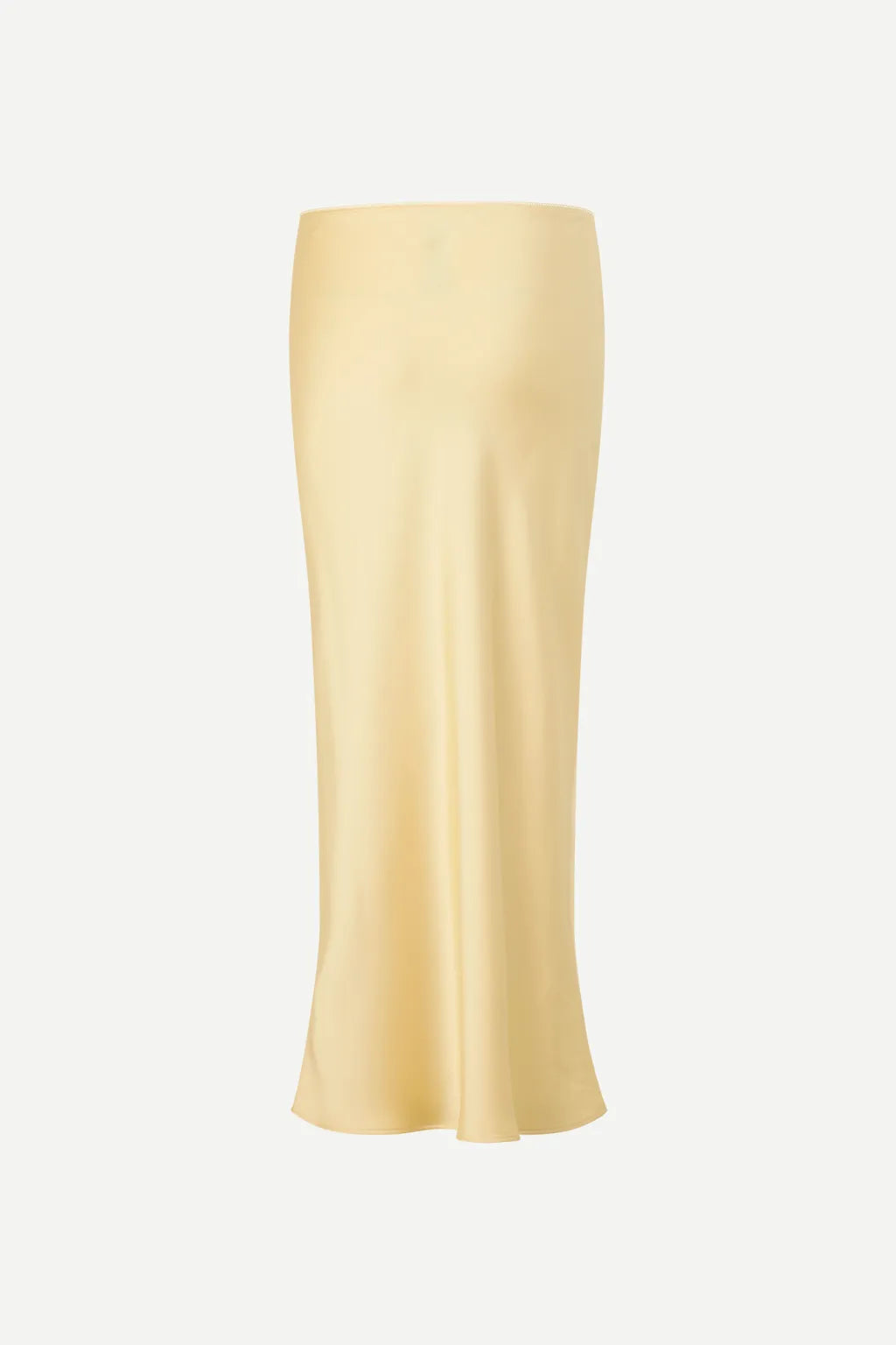 Damen-Maxirock in warmem Gelb – leicht & stilvoll Sommerlicher Maxirock aus fließendem Satin in leuchtendem Gelb. Die schmale Passform und der elastische Bund sorgen für bequemen Sitz mit femininer Silhouette. Gefertigt aus 100 % recyceltem Polyester – nachhaltig schön durch den Sommer.